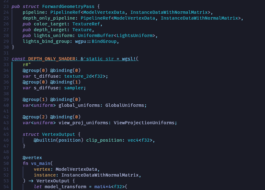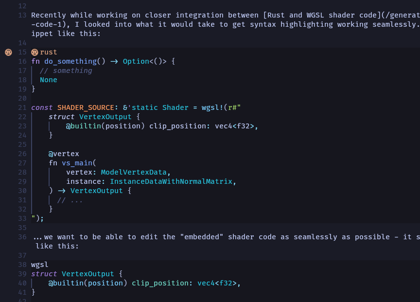 Recently while working on closer integration between Rust and WGSL shader code, I looked into what it would take to get syntax highlighting working seamlessly. With a snippet like this: